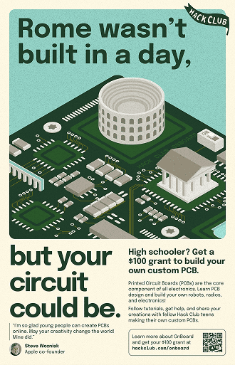Poster design for Hack Club's OnBoard program, a funding program sending over $100,000 in funding for high schoolers to build their own PCBs.