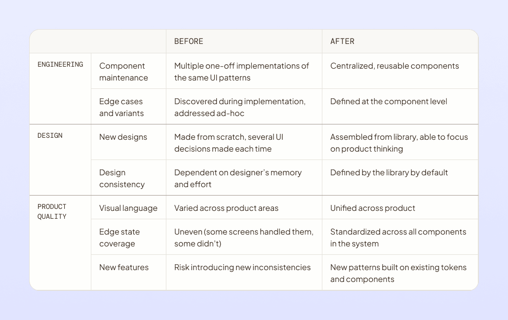 Patterns and components multiplied all over the codebase with no shared language between design and engineering, with every new feature inheriting the inconsistency of the last.