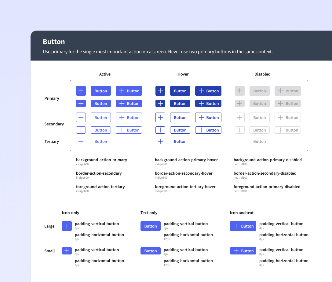 Component specs lived in Figma, capturing variants, states, and token references. Engineers were referencing it actively during the build phase, which meant documentation was being stress-tested in real time rather than written for a hypothetical future user.