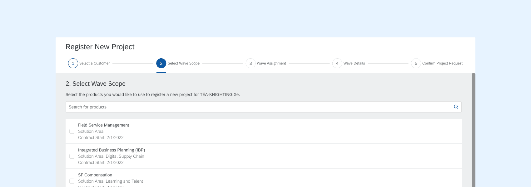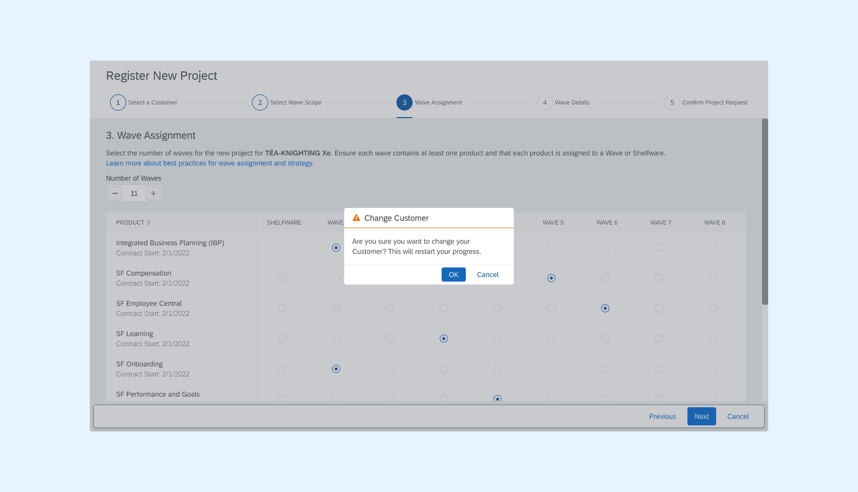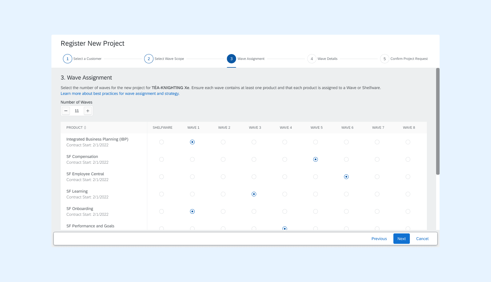 Partners needed to schedule their project into a variable number of stages or “waves”, each containing multiple products, but with no product appearing in more than one wave. A radio button matrix fit naturally: rows for products, columns for waves, and a selection model that made the constraint intuitive rather than something users had to remember.